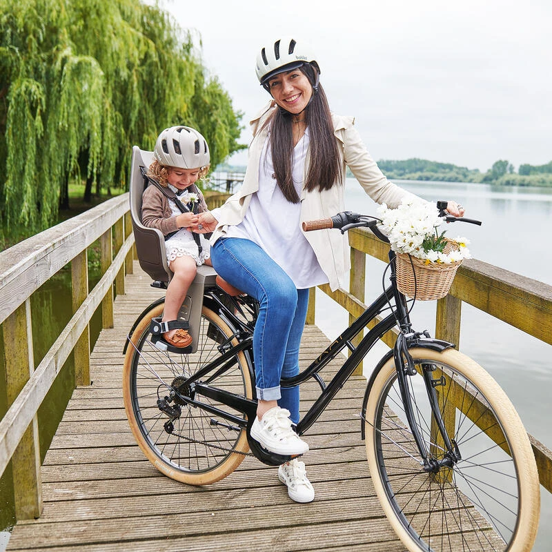 Siège arrière aux cadre. Coque extra enveloppante, harnais 5 points et rembourrage imperméable, avec LED. Pour les vélos de ville, trekking, VTT. De 9 mois à 6 ans, 22 kg maximum.